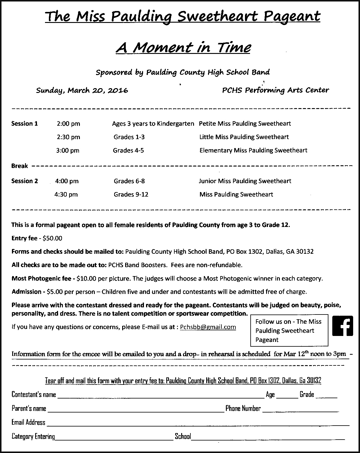 This event is sponsored by Paulding County High School Band. The pageant will be held on Sunday, March 20th, 2016 at the PCH S performing arts Center. This is a formal pageant open to all female residents of Paulding County from age 3 to grade 12. The entry fee is $50 this is payable to the PCHS Band Boosters. All fees are nonrefundable admission to our event is five dollars per person, children five (and under) and contestants will be admitted free of charge. Contestants will be judged on beauty poise personality and dress. No talent or sportswear competition. If you have any questions please email us at