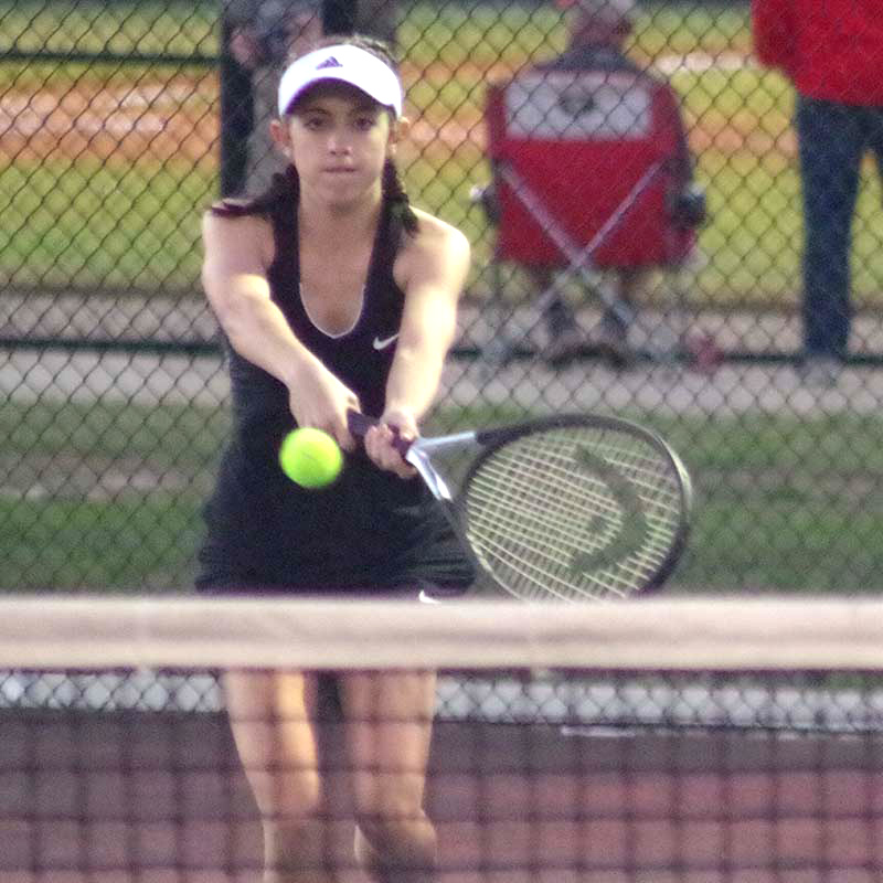 ​Spartan sophomore Emma Clarke lines up a backhand in her match against Douglas County.