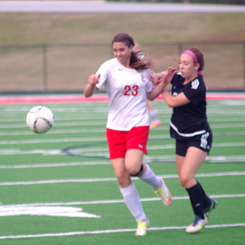 Kimberlyn Black mixes it up with a Lady Trojan midfielder for control of the ball.